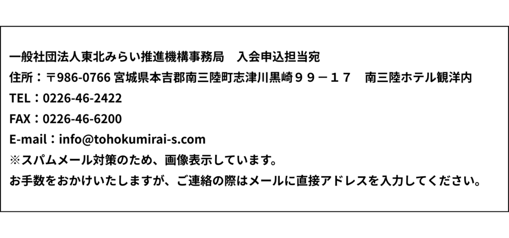 一般社団法人東北みらい推進機構は、活動にご賛同いただける会員様を募集しています。入会をご希望の方は、入会申込書に必要事項をご記入の上、郵送または電子メールでご送付ください。